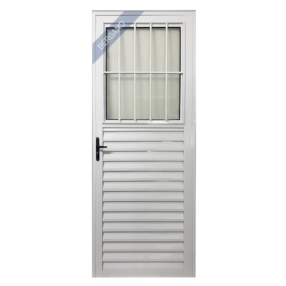 A porta social de alumínio é constituída na parte inferior em palhetas e a parte superior com postigo móvel, muito utilizada em cozinhas, lavanderias, corredores entre outros ambientes do imóvel.