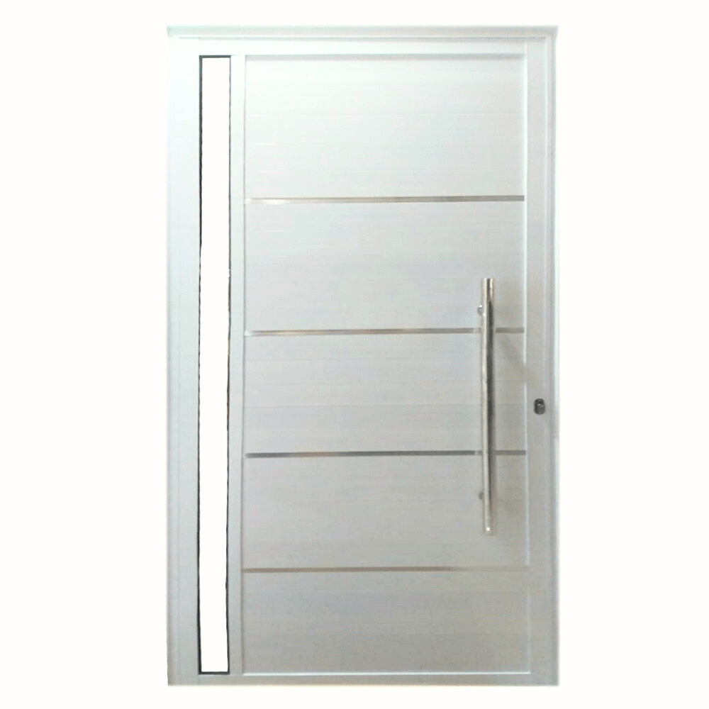 Fabricada em alumínio e revestida com pintura eletrostática branca, a porta de Alumínio Pivotante com Puxador, Friso e Visor, vem sendo muito usada por ser muito resistente e por ter uma vida útil duradoura além de ter uma aparência futurista.