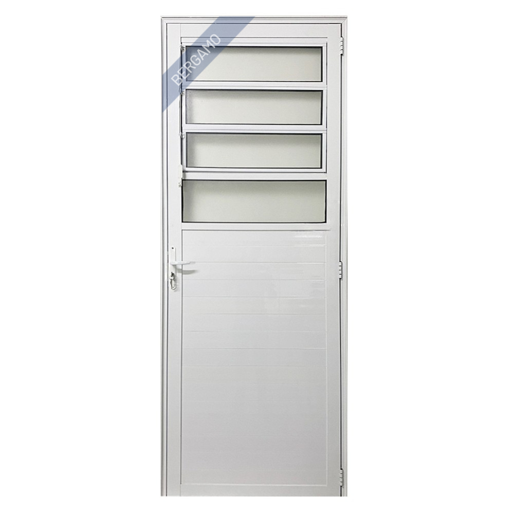 A porta social de alumínio é constituída na parte inferior em lambril e a parte superior com basculantes, muito utilizada em cozinhas, lavanderias, corredores entre outros ambientes do imóvel.